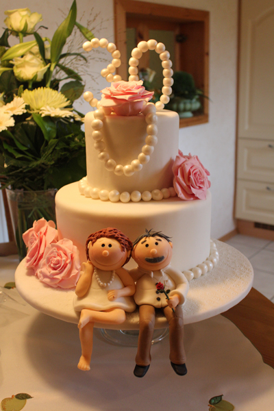 ich beschäftige mich erst seit wenigen Monaten mit dem Thema Fondant- und Motivtorten. Seitdem ich stolzer Besitzer des Buches „Bettys Sugar Dreams“ bin, möchte ich es niiiiieeee wieder hergeben, ICH LIEBE ES! Gerade für Anfänger ist dieses Buch ein MUSS, es ist alles so toll und leicht verständlich erklärt, mit ganz vielen Fotos, Rezepten und wunderbaren Torten! Vielen Dank dafür, ich hoffe es folgen noch viele weitere Bücher. Hier seht ihr meine ersten beiden Motivtorten, die ich mit Eurer Hilfe kreiert habe. Die Schutzengel-Torte war ein Geschenk für meine liebe Schwiegermutti, die 2- stöckige Torte habe ich für für meine Eltern zur Perlenhochzeit gebacken 🙂